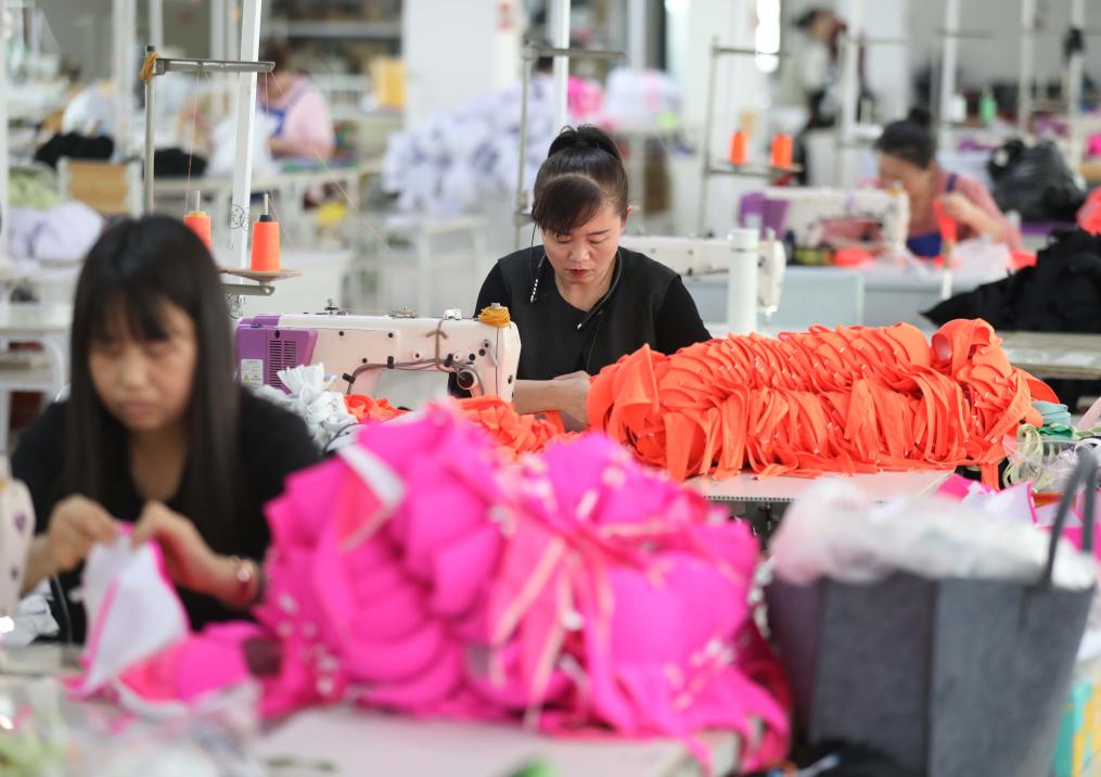 圖為4月18日,興城一家泳裝企業(yè)生產(chǎn)車間,工人在生產(chǎn)泳裝。新華社記者 楊青 攝