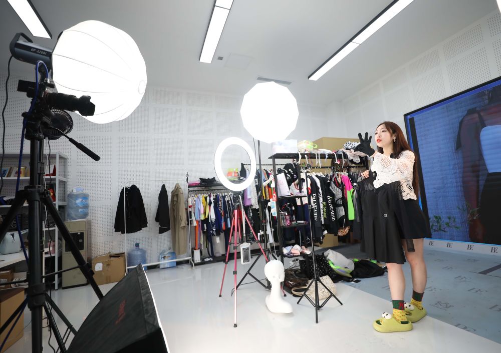 圖為4月18日,葫蘆島一家泳裝企業(yè)在直播售賣泳裝。新華社記者 楊青 攝