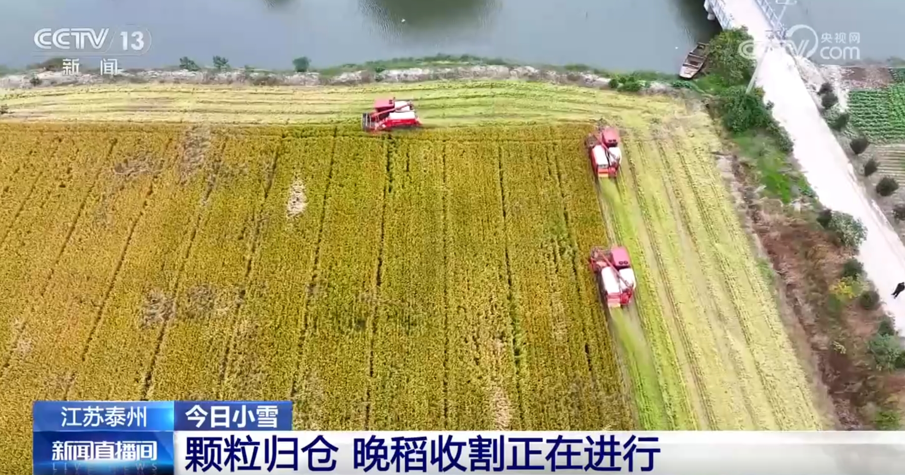 我們現(xiàn)在看到的是江蘇泰州正在進(jìn)行的晚稻收割作業(yè)。這個(gè)時(shí)候,當(dāng)?shù)卦绲竞椭械疽呀?jīng)收獲完成,收割機(jī)正開足馬力進(jìn)行晚稻收獲,割穗、脫粒、粉碎秸稈,一氣呵成,連倒伏的稻穗也被采收干凈,金黃飽滿的稻谷順著管道傾瀉而下,顆粒歸倉(cāng)。
