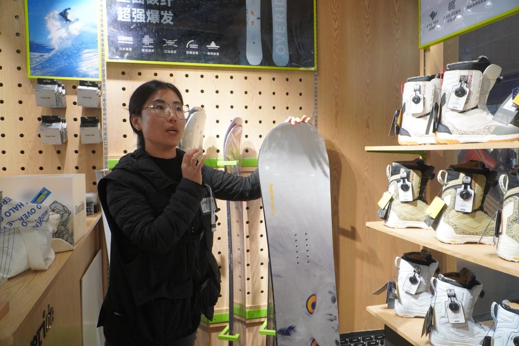 位于吉林省北大湖滑雪度假區(qū)的國(guó)產(chǎn)滑雪裝備品牌Overide門店內(nèi),店長(zhǎng)賈曉娜在介紹滑雪板性能。新華社記者孫逸軒 攝