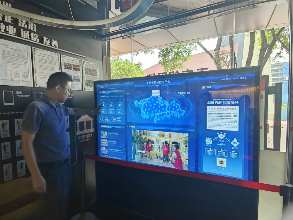 麓湖公園社區(qū)工作人員在介紹志愿者積分數(shù)字平臺。新華社記者董小紅 攝