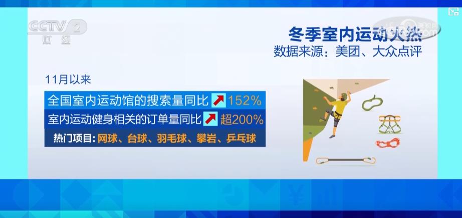 數(shù)據(jù)顯示,11月以來,全國室內(nèi)運(yùn)動(dòng)館的搜索量同比增長152%,與室內(nèi)運(yùn)動(dòng)健身相關(guān)的訂單量同比增長超200%,網(wǎng)球、臺球、羽毛球、攀巖、乒乓球是其中的熱門項(xiàng)目。