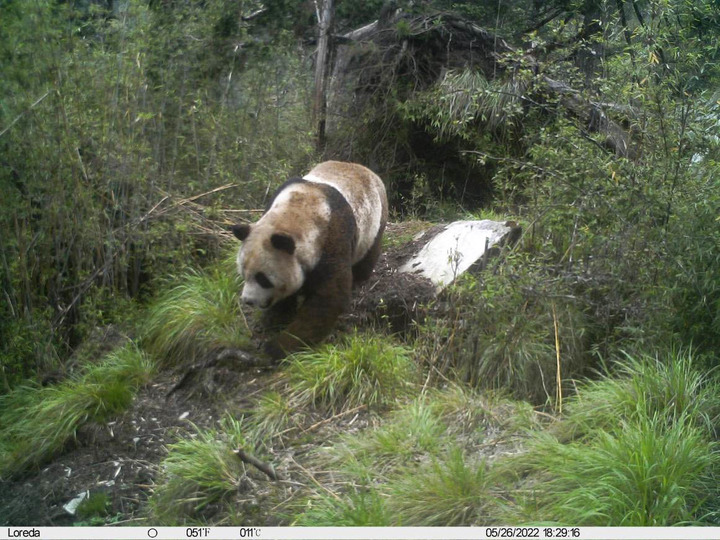 這是大熊貓國家公園唐家河片區(qū)白熊坪區(qū)域的一臺紅外相機拍攝到的野生大熊貓畫面(2022年5月26日攝)。新華社發(fā)(大熊貓國家公園唐家河片區(qū)供圖)