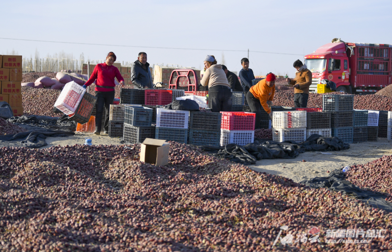 11月29日,策勒縣農(nóng)民在晾曬場搬運(yùn)紅棗。