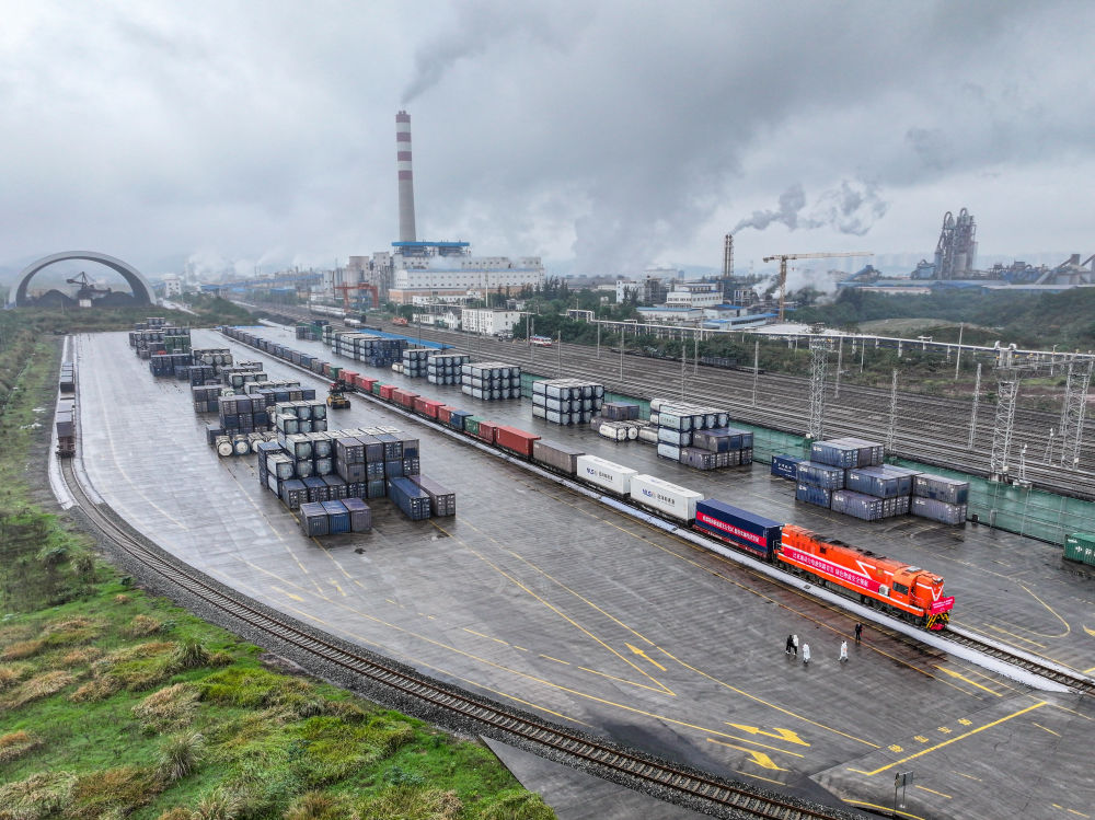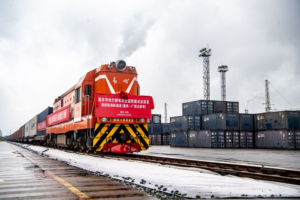11月19日,重慶市動力鋰電池全國鐵路試運首發(fā)班列在重慶長壽渝巴專用鐵路等待發(fā)車。新華社記者 唐奕 攝