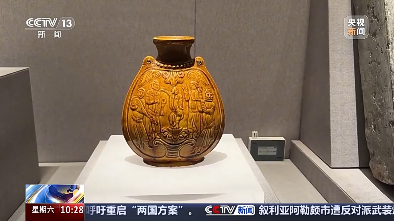 2000多年前,張騫出使西域,絲綢之路得以正式貫通。到了南北朝時(shí)期,陶瓷、鐵器等商品,就通過絲綢之路被大量運(yùn)往西域,胡樂、胡舞也通過絲綢之路進(jìn)入中原。河南博物院收藏的一件黃釉扁壺,留下了這段時(shí)期東西方文化交流的歷史痕跡。