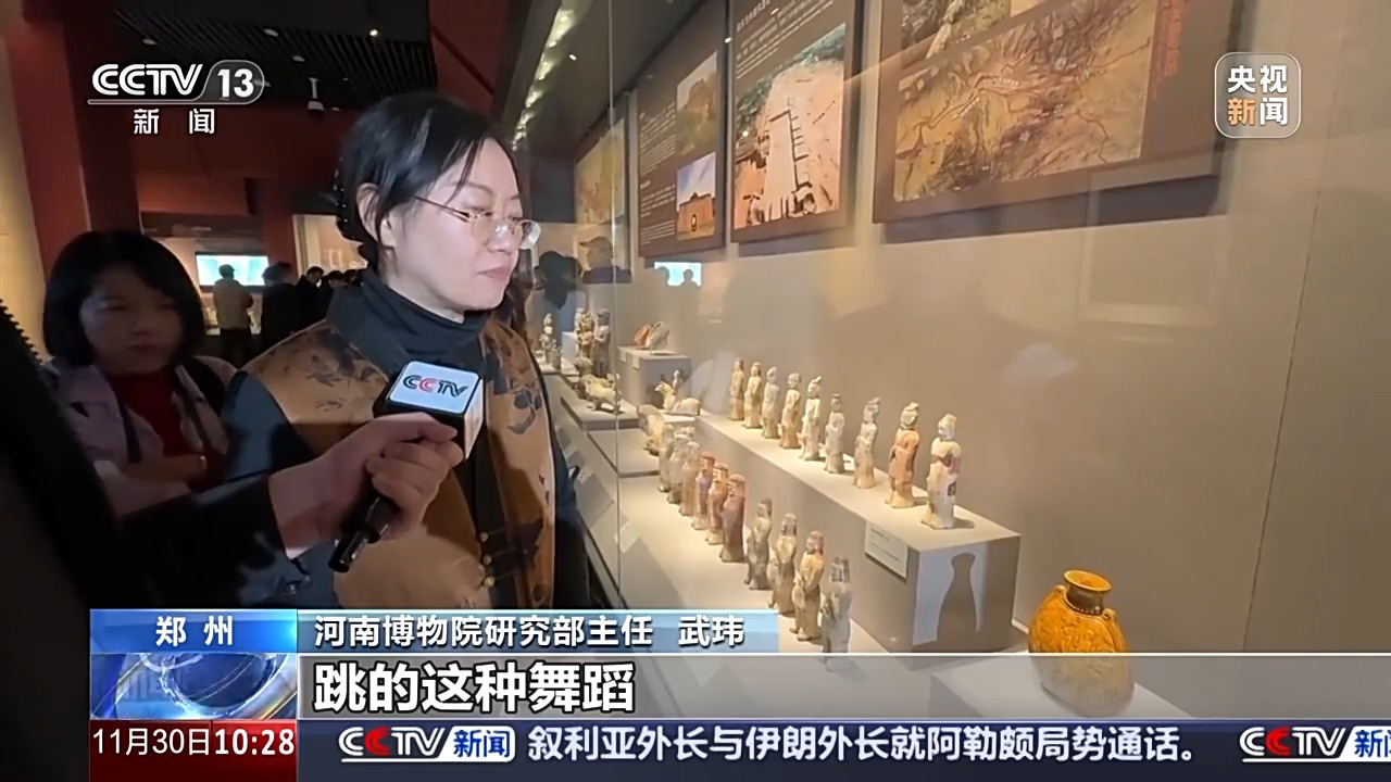 河南博物院研究部主任 武瑋:樂舞者的形象高鼻深目,戴有一種翻帽,穿的是那種圓領(lǐng)或者是翻領(lǐng)的長(zhǎng)袍。當(dāng)時(shí)的人稱為胡人的形象,跳的這種舞蹈,包括使用的樂器,可能最主要是來自中亞。