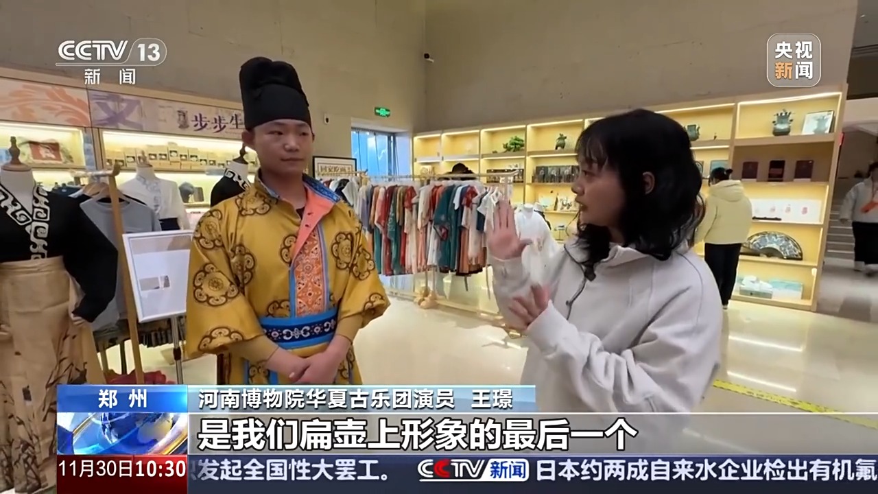 河南博物院華夏古樂團(tuán)演員 王璟:我們也是依據(jù)一些文獻(xiàn)記載,比如說我們有一個(gè)動(dòng)作是提臀動(dòng)胯,是當(dāng)時(shí)的一個(gè)胡人的舞蹈形象。還有揚(yáng)眉動(dòng)目是我們扁壺上形象的最后一個(gè)。