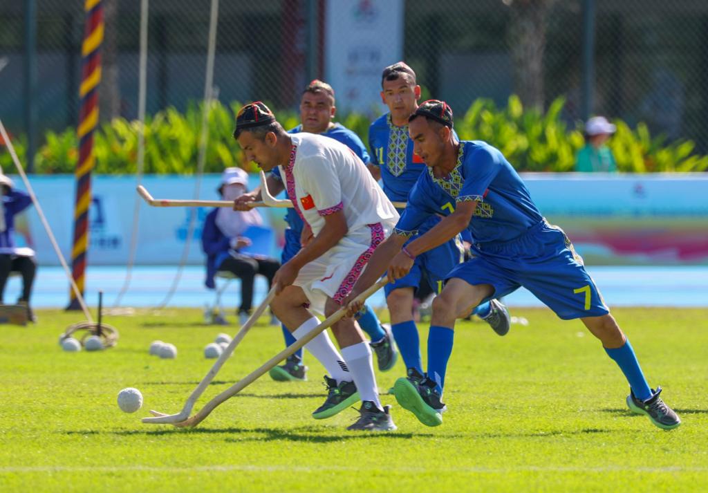 11月24日,在三亞市體育中心舉行的第十二屆全國(guó)少數(shù)民族傳統(tǒng)體育運(yùn)動(dòng)會(huì)室外表演項(xiàng)目中,新疆隊(duì)球員阿卜杜拉艾孜則·阿卜杜海娃爾(前右)在麥熱球表演中。新華社記者 陳朔 攝