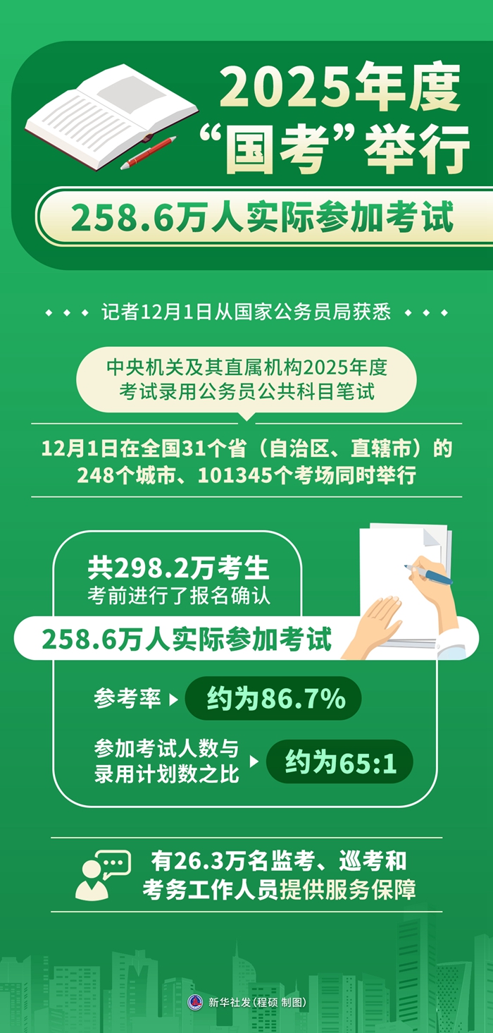 新華社北京12月1日電 記者1日從國(guó)家公務(wù)員局獲悉,中央機(jī)關(guān)及其直屬機(jī)構(gòu)2025年度考試錄用公務(wù)員公共科目筆試1日在全國(guó)31個(gè)省(自治區(qū)、直轄市)的248個(gè)城市、101345個(gè)考場(chǎng)同時(shí)舉行,共298.2萬(wàn)考生考前進(jìn)行了報(bào)名確認(rèn)、258.6萬(wàn)人實(shí)際參加考試,參考率約為86.7%,參加考試人數(shù)與錄用計(jì)劃數(shù)之比約為65:1,有26.3萬(wàn)名監(jiān)考、巡考和考務(wù)工作人員提供服務(wù)保障。