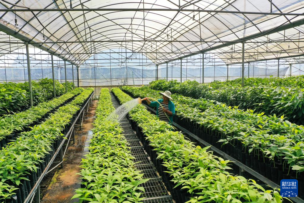 一名工作人員在普洱綠銀生物股份有限公司的牛油果種苗基地給牛油果種苗澆水(10月28日攝,無人機(jī)照片)。新華社記者 陳欣波 攝