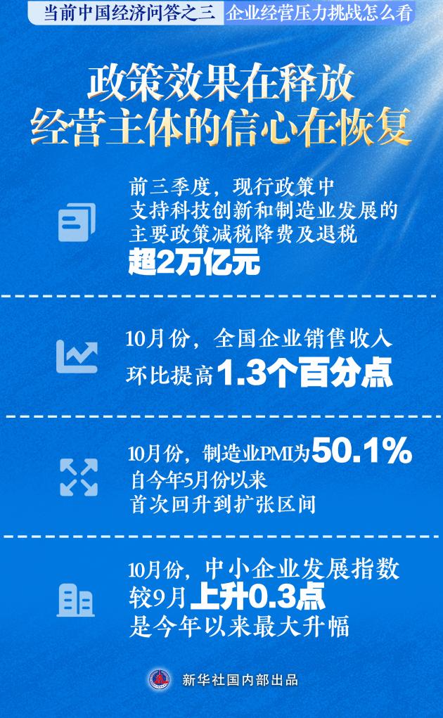 10月份,全國企業(yè)銷售收入同比增長,環(huán)比提高1.3個百分點;制造業(yè)PMI為50.1%,自今年5月份以來首次回升到擴(kuò)張區(qū)間;非制造業(yè)商務(wù)活動指數(shù)連續(xù)數(shù)月穩(wěn)定在50%左右;中小企業(yè)發(fā)展指數(shù)較9月上升0.3點,是今年以來最大升幅。