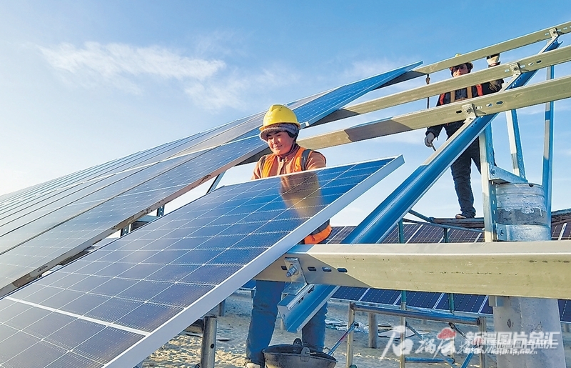 12月1日,位于和田市吉亞鄉(xiāng)的華潤新能源50萬千瓦光伏治沙項目施工現(xiàn)場一派熱火朝天景象。該項目總投資約15億元,預計明年5月底實現(xiàn)全容量投產(chǎn)。圖為工人在鋪設光伏板。 石榴云/新疆日報記者 湯永攝