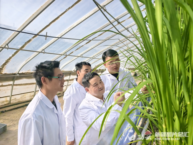 11月20日,和田地區(qū)和田縣萬畝設施農(nóng)業(yè)基地沙漠溫室水稻種植大棚內(nèi),中國農(nóng)業(yè)科學院都市農(nóng)業(yè)研究所首席科學家楊其長團隊正在查看水稻長勢。胡禮政攝