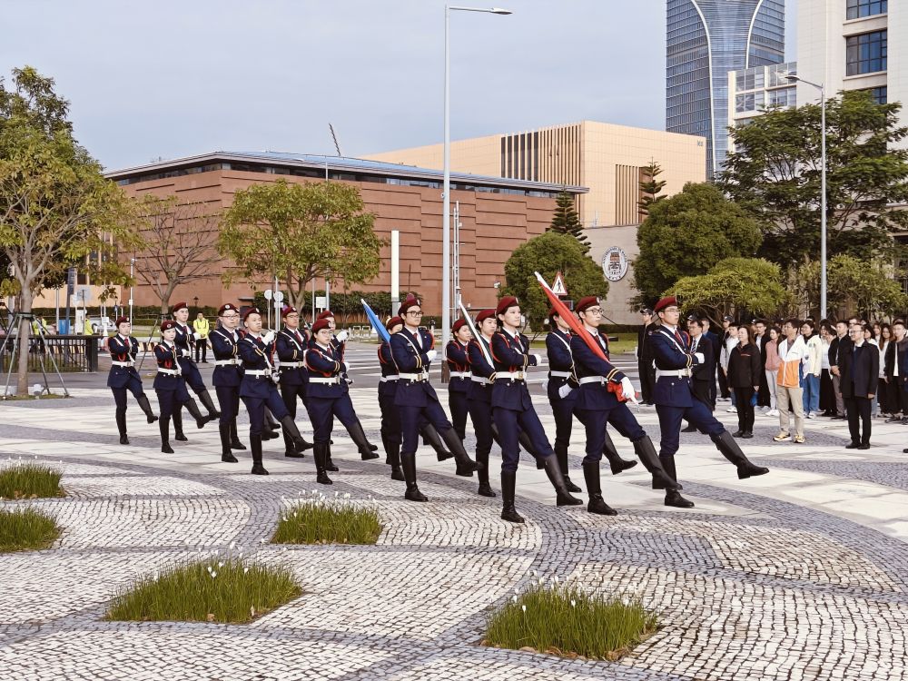 “正步走!”早晨八點(diǎn),曙光照拂澳大蓮花廣場(chǎng),身著海軍藍(lán)制服的學(xué)生邁著鏗鏘有力的步伐走向升旗臺(tái)。國(guó)歌響起,五星紅旗在澳門(mén)特區(qū)區(qū)旗和澳門(mén)大學(xué)校旗映襯下,冉冉升起,迎風(fēng)招展。