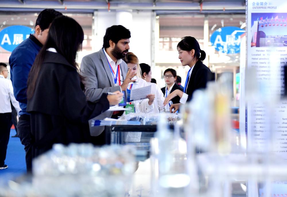 2024年10月10日,采購商(中)在2024年中國·永年緊固件基地國際采購大會現場了解緊固件產品信息。新華社記者 王曉 攝