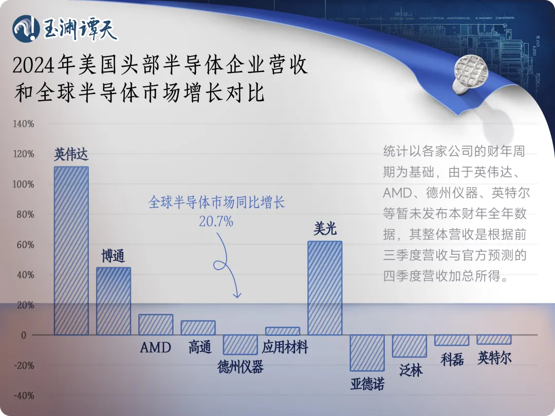 2024年,全球芯片市場都在回暖,預(yù)計(jì)同比增長20.7%。與此同時(shí),英偉達(dá)2024年?duì)I收預(yù)計(jì)同比增長超100%,成為美國芯片市場增長最大的動(dòng)力。
