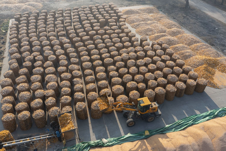 2024年11月13日,在黑龍江省肇東市一處秋糧晾曬場(chǎng),海城雙麗現(xiàn)代農(nóng)機(jī)專業(yè)合作社的農(nóng)民駕駛農(nóng)機(jī)堆放玉米(無(wú)人機(jī)照片)。新華社記者 謝劍飛 攝