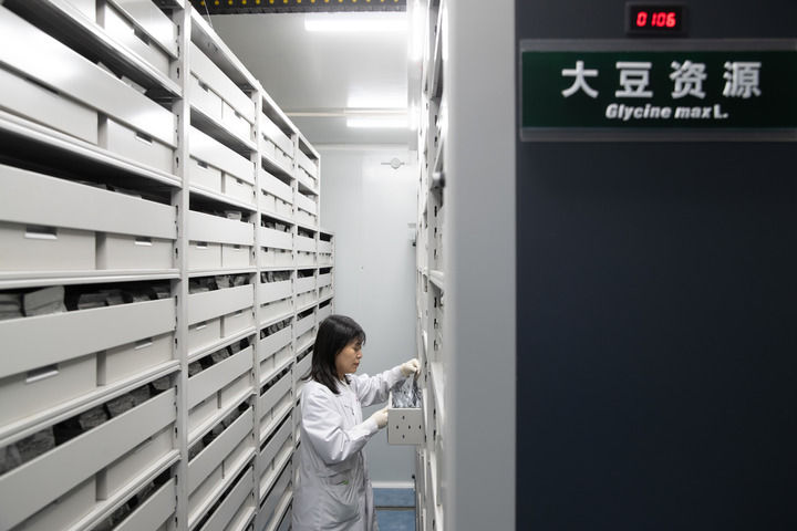 2024年4月2日,工作人員在國(guó)家寒帶作物及大豆種質(zhì)資源中期庫(kù)(哈爾濱)查看大豆種質(zhì)情況。新華社記者 張濤 攝