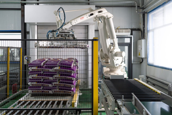 2024年3月29日,黑龍江省黑河市五大連池市一家農(nóng)業(yè)科技企業(yè)的機(jī)械臂在車間內(nèi)碼放包裝好的大豆種子。新華社記者 謝劍飛 攝