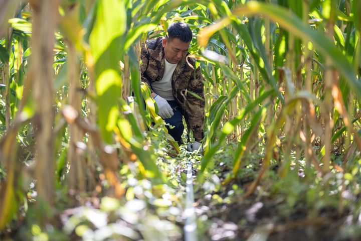 2024年9月24日,黑龍江省寶清縣農(nóng)業(yè)技術(shù)推廣中心的農(nóng)藝師在寶清縣青原鎮(zhèn)一片玉米地中測(cè)產(chǎn)。新華社記者 謝劍飛 攝