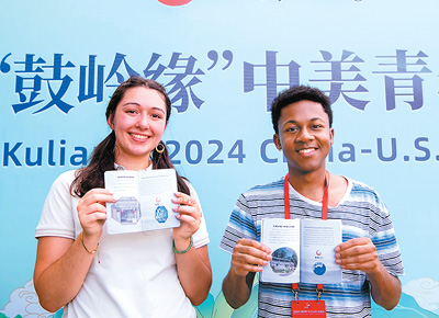 參加2024“鼓嶺緣”中美青年交流周活動的兩名學(xué)生代表展示在鼓嶺“打卡”“蓋章”。新華社記者 魏培全攝