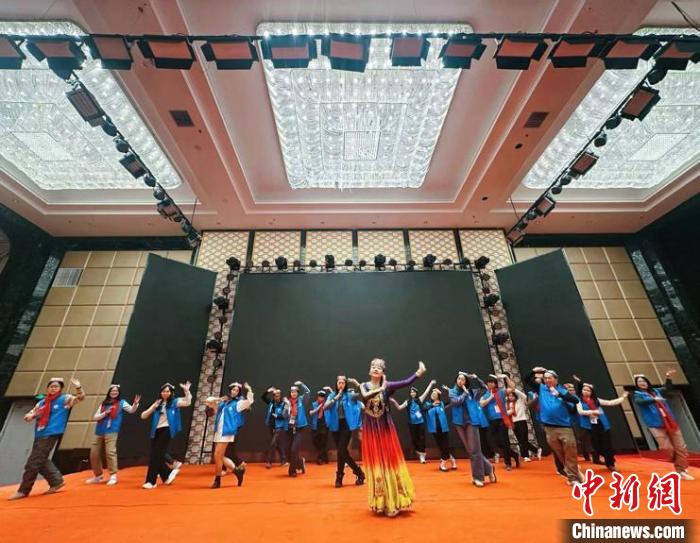 圖為參加交流團(tuán)的香港青年(藍(lán)衣)跟隨當(dāng)?shù)孛癖妼W(xué)習(xí)新疆特色舞蹈?!≈鬓k方 供圖