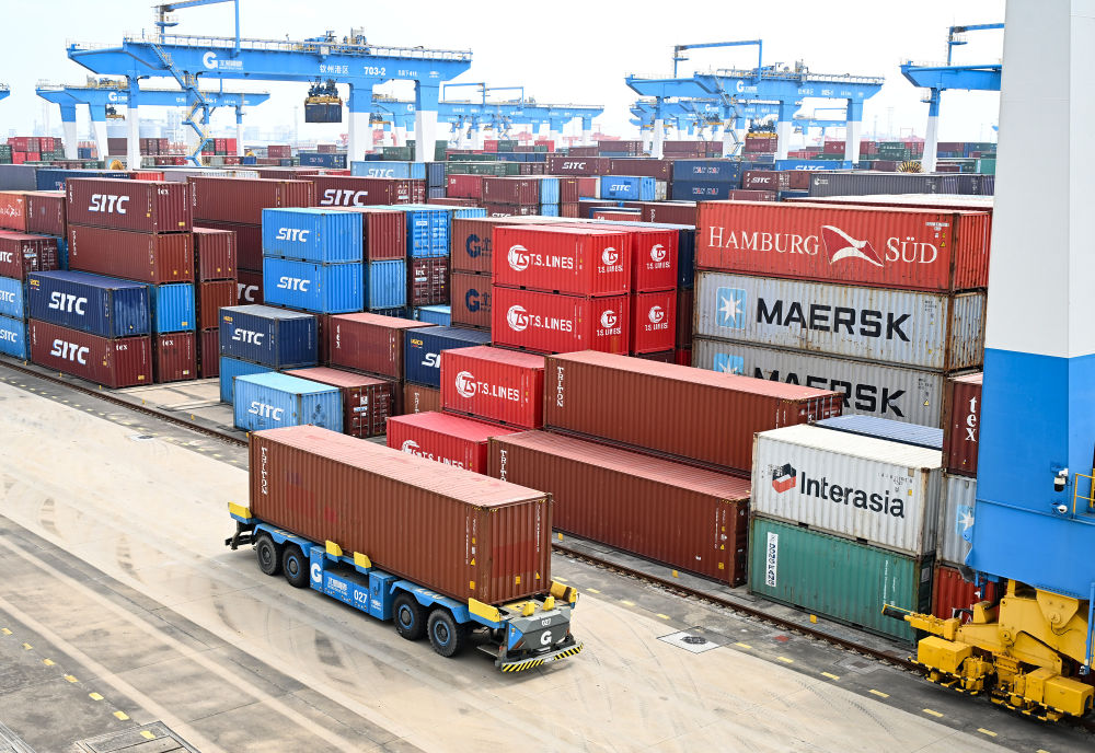 2024年10月20日,在廣西北部灣港欽州港區(qū)碼頭,一輛自動(dòng)化無人轉(zhuǎn)運(yùn)車在運(yùn)送集裝箱。各式各樣運(yùn)往東盟各國(guó)的貨物在這個(gè)海鐵聯(lián)運(yùn)自動(dòng)化集裝箱碼頭實(shí)現(xiàn)“下船即上車、下車即上船”。新華社記者李賀攝