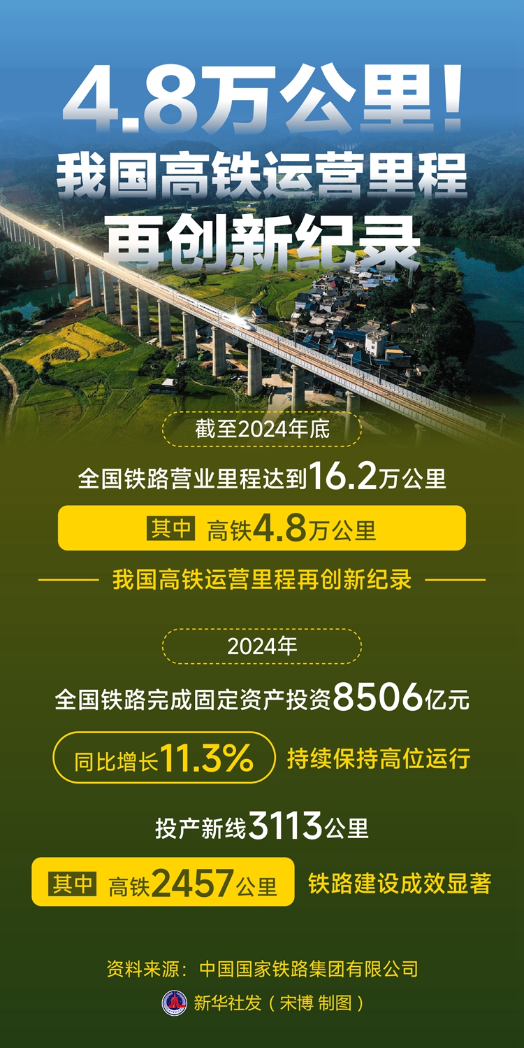 2日,中國國家鐵路集團有限公司召開工作會議。會議發(fā)布的最新統(tǒng)計數(shù)據(jù)顯示,截至2024年底,全國鐵路營業(yè)里程達到16.2萬公里,其中高鐵4.8萬公里,我國高鐵運營里程再創(chuàng)新紀錄。