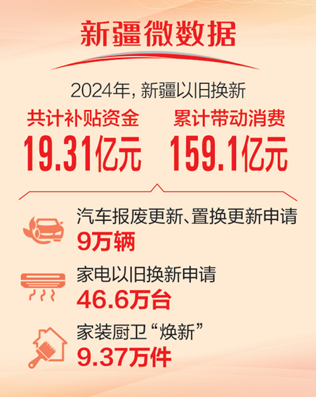 數(shù)據(jù)顯示,截至12月31日,2024年全疆范圍內(nèi)提交汽車報(bào)廢更新、汽車置換更新申請共計(jì)9萬輛,家電以舊換新申請46.6萬臺(tái),家裝廚衛(wèi)“煥新”達(dá)9.37萬件。此外,電動(dòng)自行車以舊換新數(shù)量達(dá)3.32萬輛。這些數(shù)據(jù)的背后,是新疆消費(fèi)者對高品質(zhì)生活的追求和對環(huán)保理念的積極踐行。
