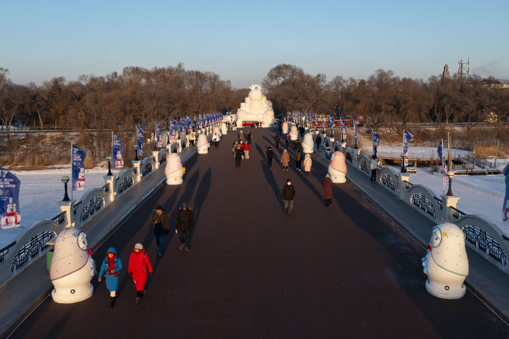 1月3日,在哈爾濱太陽島雪博會(huì)園區(qū)入口,游客經(jīng)過“雪人儀仗隊(duì)”(無人機(jī)照片)。