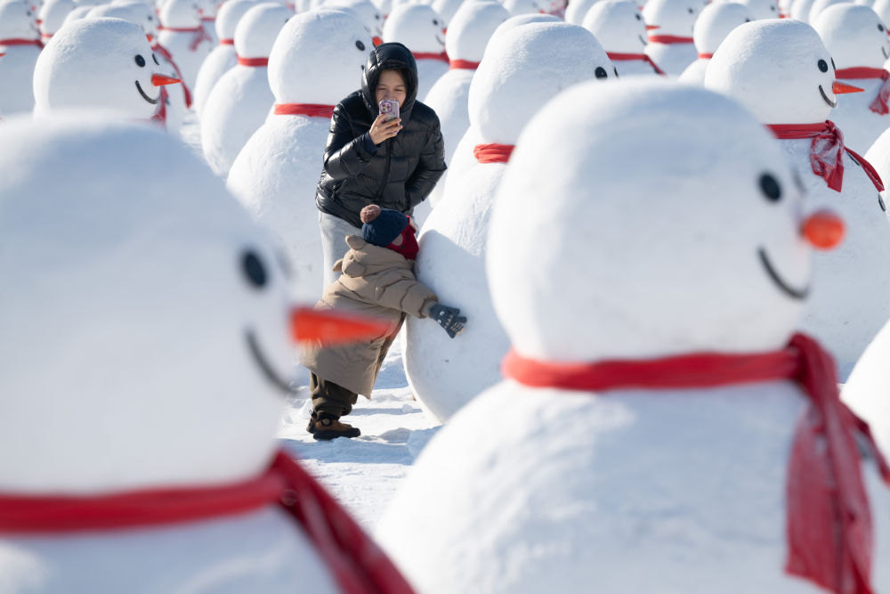 1月3日,在哈爾濱市道里區(qū)群力大道,游客在一家商場(chǎng)前的“雪人軍團(tuán)”處游玩。