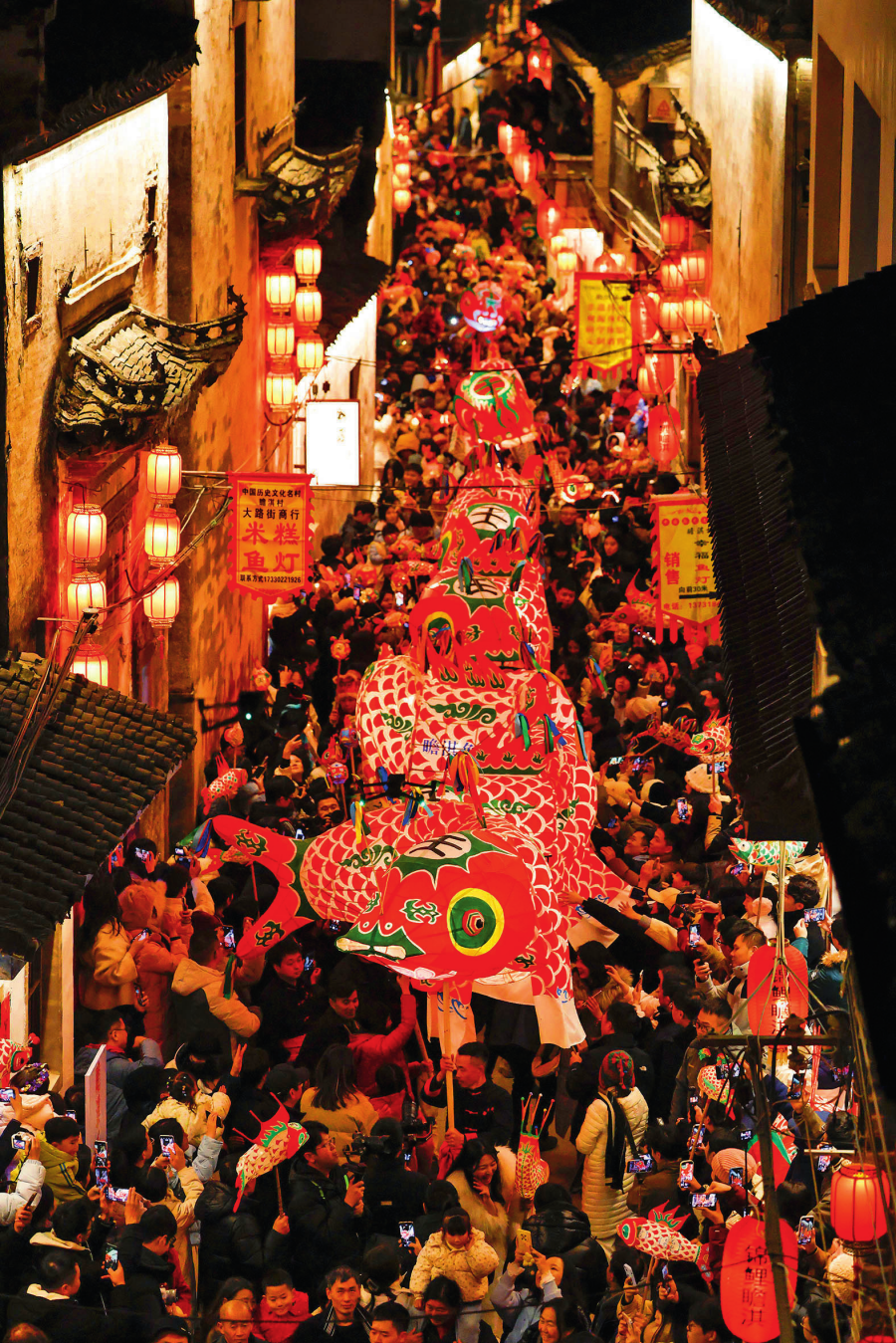 在安徽省黃山市歙縣北岸鎮(zhèn)瞻淇村,村民舞動(dòng)非遺魚(yú)燈,吸引了眾多游客(2024 年 12 月 31 日攝) 施亞磊攝 / 本刊