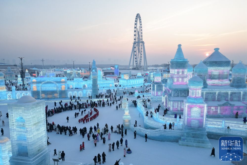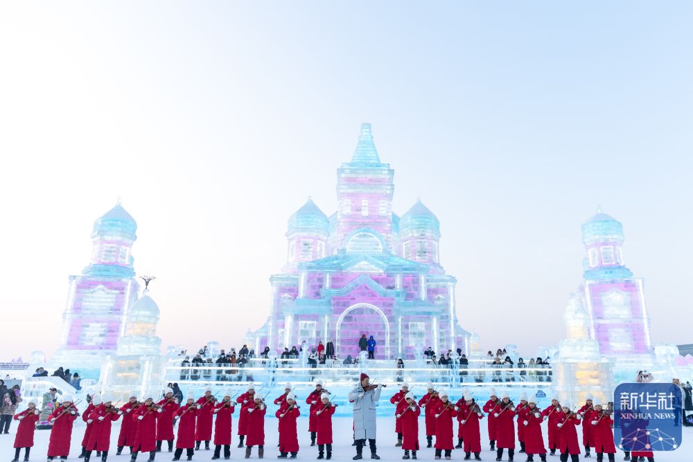 當(dāng)日,哈爾濱冰雪大世界園區(qū)上演音樂“快閃”,為即將到來的亞冬會助力。