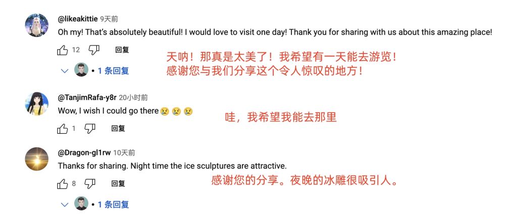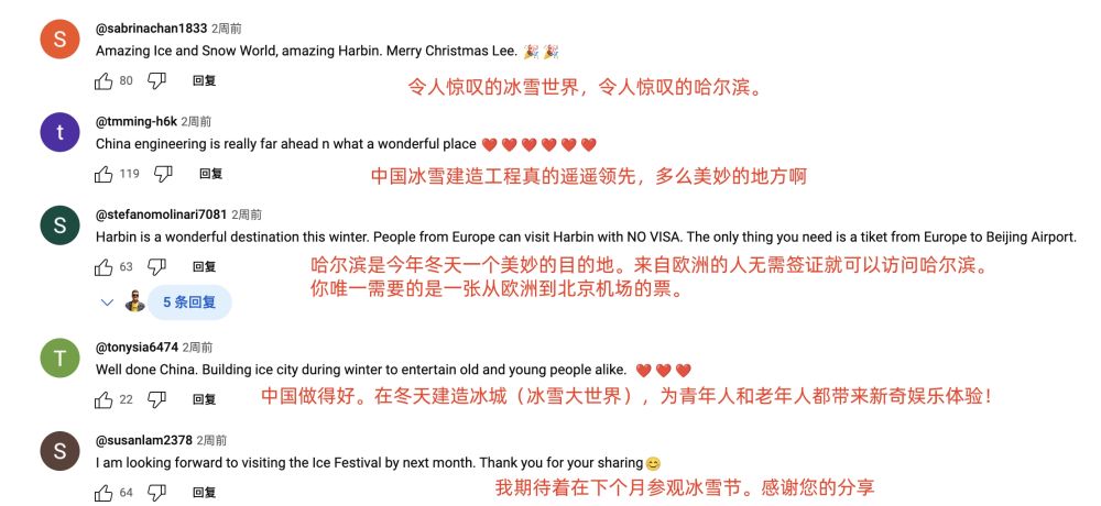 眾多海外博主仿佛找到了“流量密碼”,那就是發(fā)布來哈爾濱旅行Vlog,上傳和冰雕的打卡美照,評論區(qū)互動好評如潮。