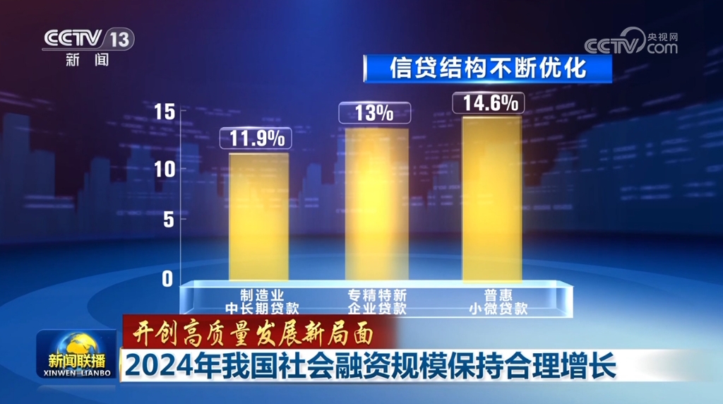 中國(guó)人民銀行相關(guān)負(fù)責(zé)人介紹,2024年12月末,社會(huì)融資規(guī)模存量為408.34萬(wàn)億元,其中,對(duì)實(shí)體經(jīng)濟(jì)發(fā)放的人民幣貸款余額為252.53萬(wàn)億元,同比增長(zhǎng)7.2%。信貸結(jié)構(gòu)不斷優(yōu)化,制造業(yè)中長(zhǎng)期貸款、專精特新企業(yè)貸款、普惠小微貸款增長(zhǎng)較快,繼續(xù)高于同期全部貸款增速。