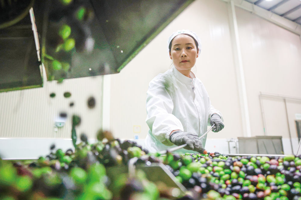 10月31日,在甘肅省隴南市武都區(qū)一家油橄欖加工企業(yè),工作人員在生產(chǎn)線上作業(yè)。 新華社記者 陳斌 攝