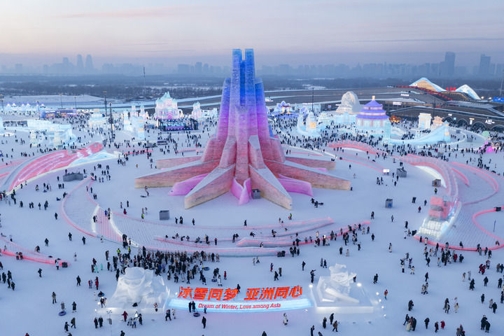 2025年1月5日,在哈爾濱冰雪大世界園區(qū),游客在主塔“亞洲同心”附近游玩(無(wú)人機(jī)照片)。新華社記者 謝劍飛 攝