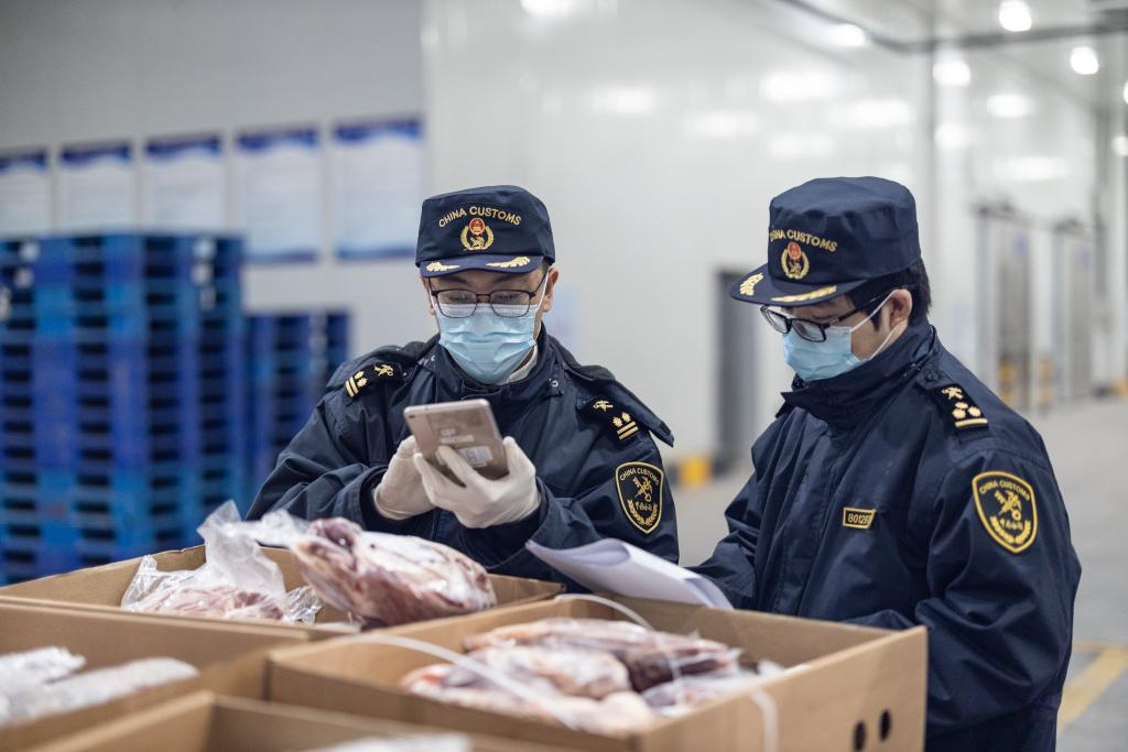 1月17日,在重慶國(guó)際物流樞紐園區(qū),重慶海關(guān)所屬渝州海關(guān)監(jiān)管科副科長(zhǎng)劉議凡(左)與同事正仔細(xì)查驗(yàn)通過(guò)中歐班列進(jìn)口的牛肉。新華社記者 黃偉 攝