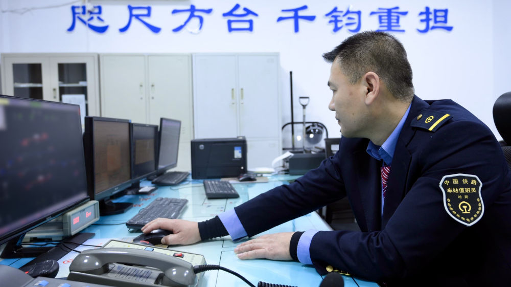 一間不大的值班室,除了床就是操作臺,“咫尺方臺 千鈞重擔”的條幅下,田春緊盯顯示屏。他負責運輸組織調(diào)度,是車站“最重要”的崗位。