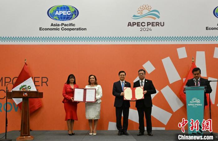 2024年11月15日,亞太經(jīng)合組織第三十一次領(lǐng)導人非正式會議期間,中國香港與秘魯在秘魯利馬簽署自由貿(mào)易協(xié)定。圖為秘魯總統(tǒng)博魯阿爾特(左二)、秘魯外貿(mào)旅游部部長萊昂(左一)、香港特區(qū)行政長官李家超(右三)、香港特區(qū)政府商務及經(jīng)濟發(fā)展局局長丘應樺(右二)完成簽署后合影。 香港特區(qū)政府新聞處供圖