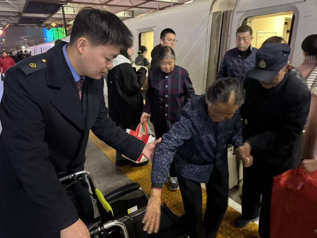 圖為1月18日,蘇州站鐵路工作人員為進城高齡老人提供暖心到站接車服務(wù)。新華社發(fā) 馬驍攝