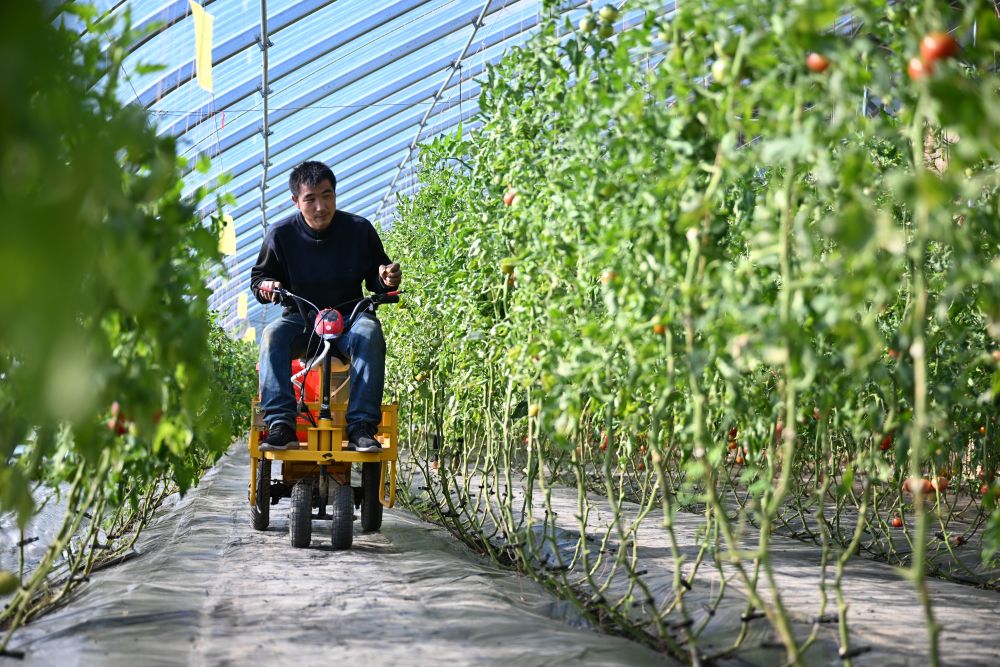 在延安市寶塔區(qū)劉興莊村,劉浪浪駕駛農(nóng)機在大棚內(nèi)運送物資。新華社記者 張斌 攝