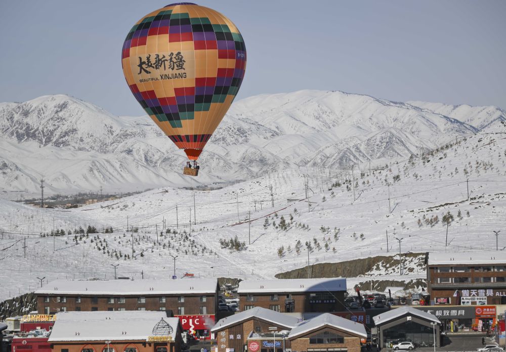 1月25日,游客在將軍山國際滑雪度假區(qū)乘坐熱氣球觀光。