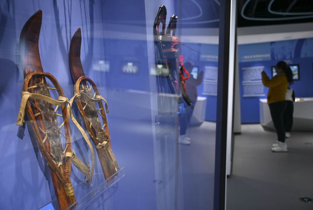 1月24日,游客在位于將軍山國際滑雪度假區(qū)的阿勒泰人類滑雪起源地博物館參觀。
