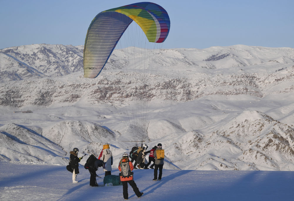 1月24日,游客在將軍山國際滑雪度假區(qū)體驗滑翔傘。