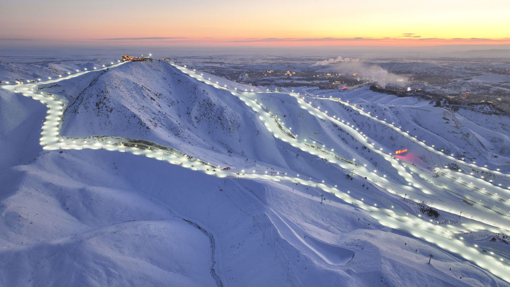 黃昏時分的將軍山國際滑雪度假區(qū)(1月24日攝,無人機照片)。將軍山國際滑雪度假區(qū)在夜間開放多條雪道,以滿足“雪友”多樣化需求。