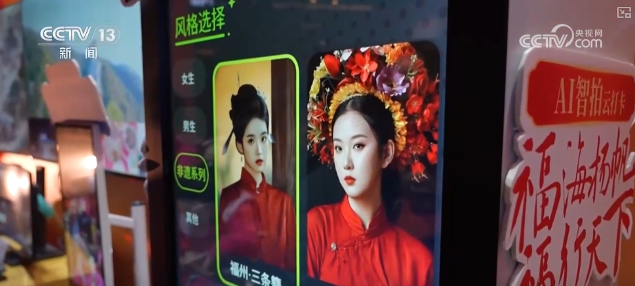 夜幕降臨,一場新春科技大秀在福州市的冶山春秋園上演了。泉州的簪花是福建文旅的頂流,在現場,一臺AI旅拍機吸引了許多游客排隊體驗。只要拍攝一張照片,就可以利用AI一鍵生成“簪花圍”造型,還能輕松在各種非遺裝扮之間來回切換。