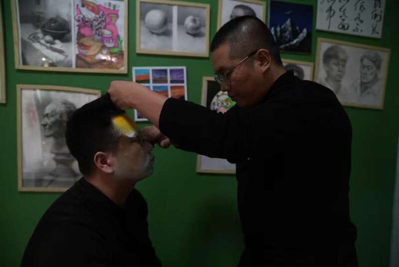 每次演出前,李曉濤要“擇臉”,決定哪張臉化哪個(gè)妝,臉大的演員有優(yōu)勢(shì),承得下更復(fù)雜更多細(xì)節(jié)的妝容;額頭高的人可以畫上半張臉細(xì)節(jié)更多的“三塊瓦”。畫著同一底色的演員表演時(shí)不能站在一起,以免觀眾有重復(fù)的感覺(jué)。