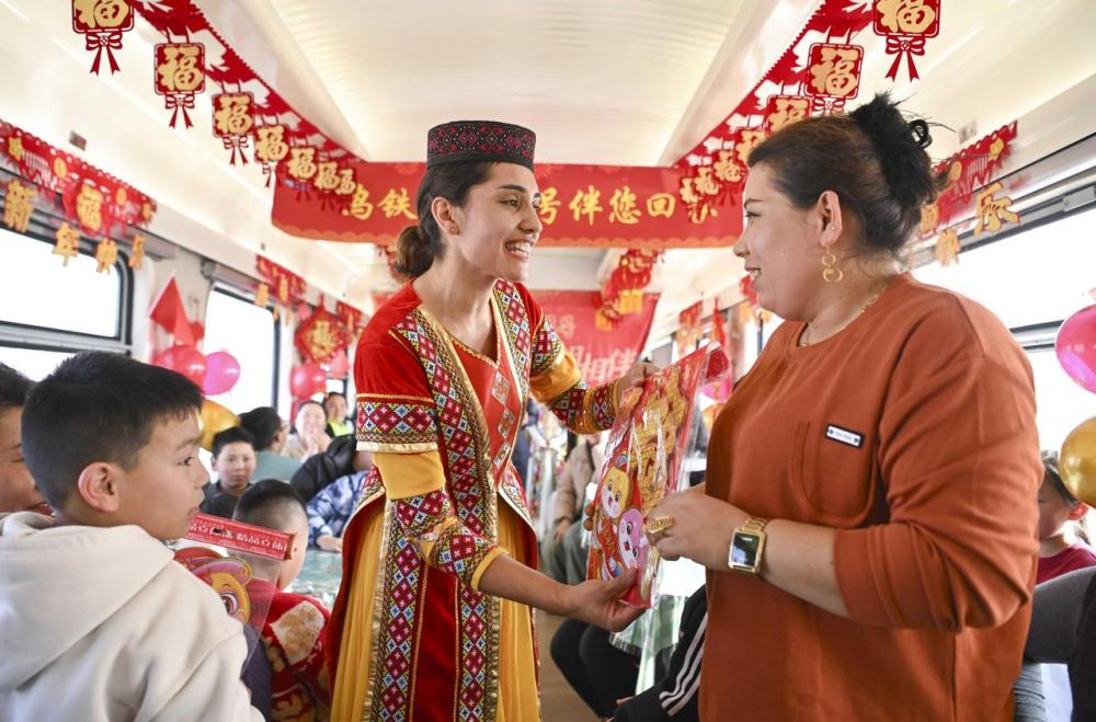 在喀什開往成都西的列車上,艾爾開牙·多力開(左)向參與“列車春晚”互動(dòng)游戲的乘客贈(zèng)送福字年畫(2025年1月17日攝)。